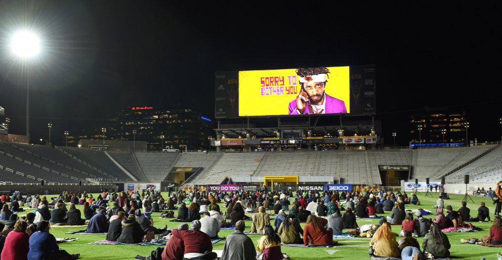 A 3,500 attendee Jumbotron Screening of Into the Spider-Verse at Sun Devil Stadium in partnership ASU Cultural Affairs. Spiderman masks were given to all the children watching, and a movie screening was transformed into a powerful demonstration of ASU’s commitment to inclusion.